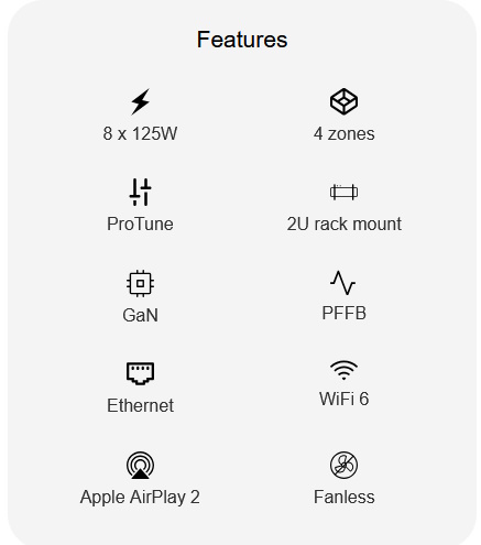 Advanced GaN technology, Class D amplification, and post-filter feedback (PFFB) deliver exceptional audio quality with high efficiency. Its textured, thermally-optimised chassis enhances performance and durability all within a compact design built for the rack.